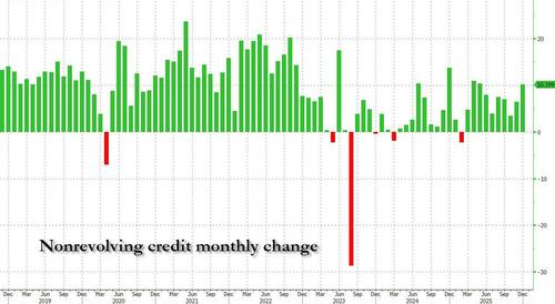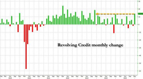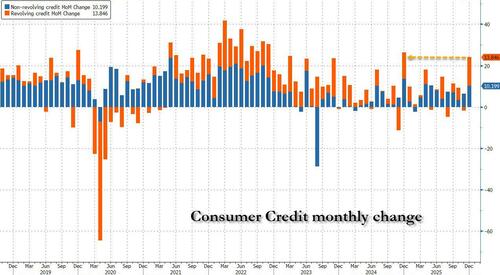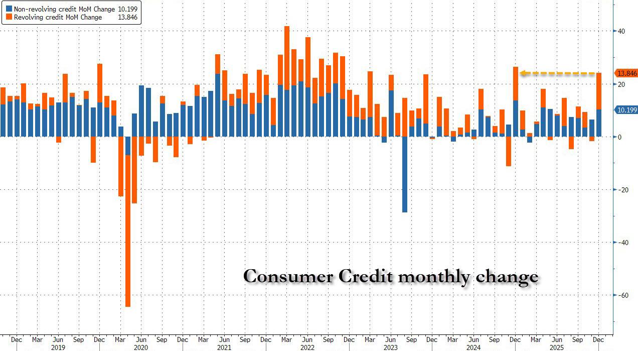 We now have the answer: at 3pm today, the Fed published the latest consumer credit data, and boy was it a doozy. After November’s tepid $4.2 billion increase in total consumer credit (which came in below estimates even after today’s revision to $4.7 billion), consensus was looking for a modest bounce to $8 billion, or well below the post-covid average. Instead, what the Fed reported was a stunner: consumer credit soared by a whopping $24.045 billion, the biggest monthly increase of 2025 by a wide margin (only Dec. 2024 was bigger going back all the way to 2023),..