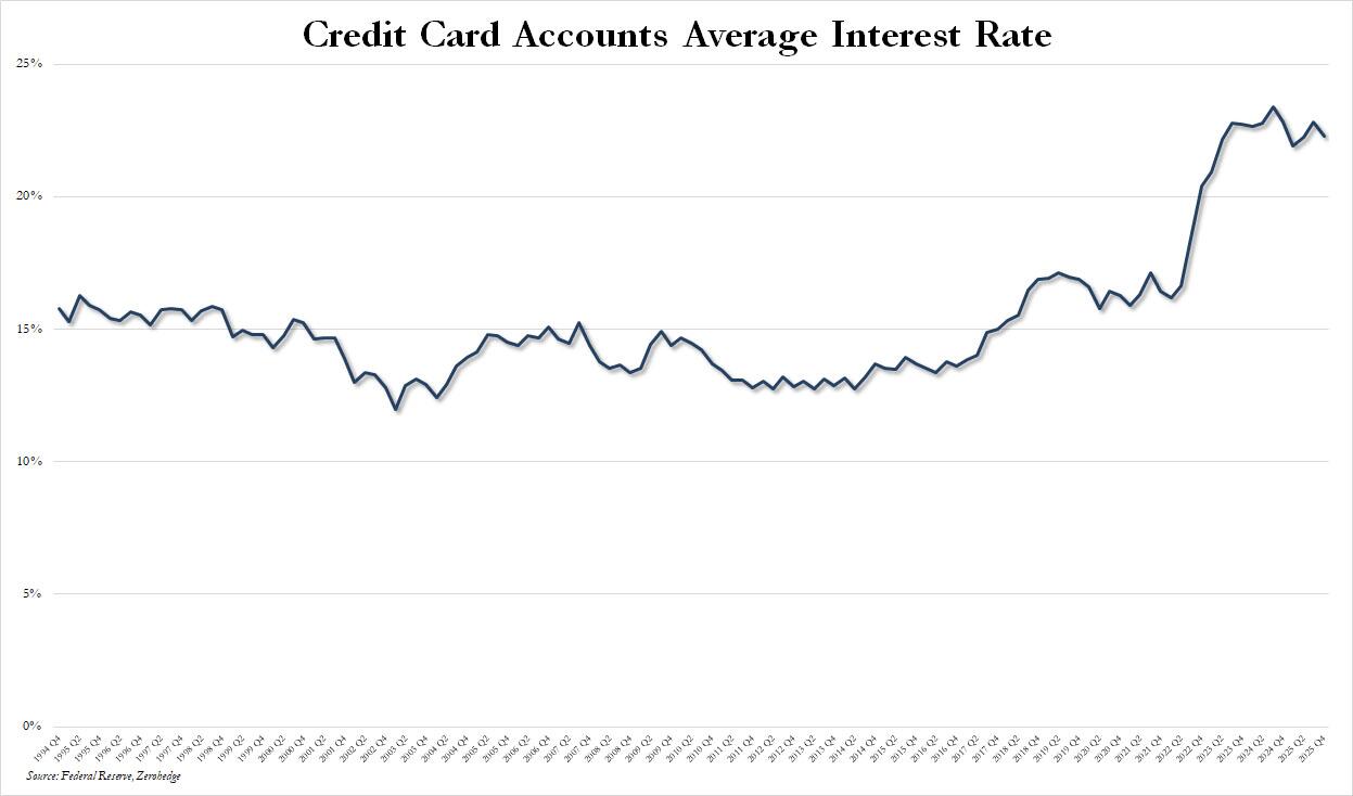 Finally, and this will come as a surprise to nobody, despite 1.75% in rate cuts by the Fed since last September, we can now confirm that rates on credit cards have gone… nowhere as banks continue to bleed US consumers dry: at the middle of 2023 the average rate on credit card accounts was 22.16%… and on Dec 31, 2025 – and a half years years later, the number was higher at 22.30%, just barely below the all time high of 23.37% set one year ago. And all thise despite 6 rate cuts by the Fed.