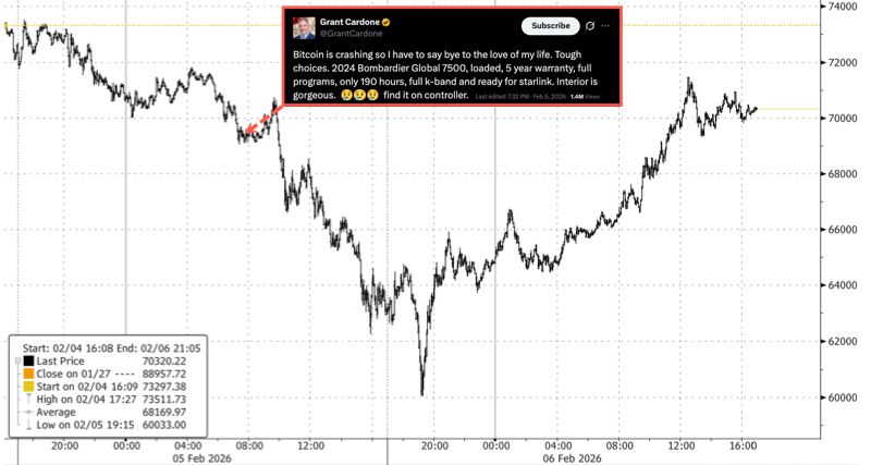 “Bitcoin is crashing so I have to say bye to the love of my life. Tough choices,” Grant Cardone posted around 7:32 p.m. ET, minutes after Bitcoin slipped to around $69,000. Hours later, in Asian trading, it crashed further to about $60,033 (has since recovered to $70,000 by EOD Friday).