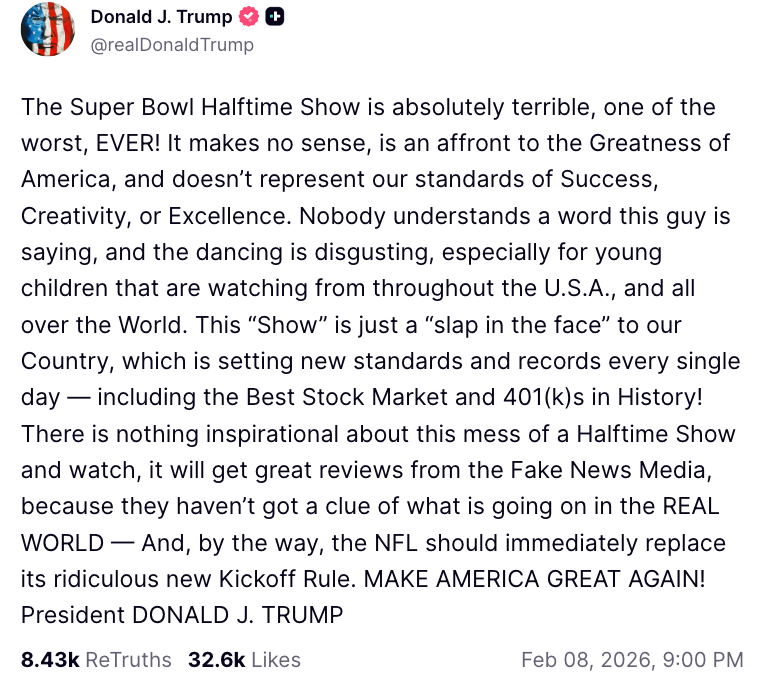 This “Show” is just a “slap in the face” to our Country, which is setting new standards and records every single day — including the Best Stock Market and 401(k)s in History! There is nothing inspirational about this mess of a Halftime Show and watch, it will get great reviews from the Fake News Media, because they haven’t got a clue of what is going on in the REAL WORLD — And, by the way, the NFL should immediately replace its ridiculous new Kickoff Rule. MAKE AMERICA GREAT AGAIN! President DONALD J. TRUMP