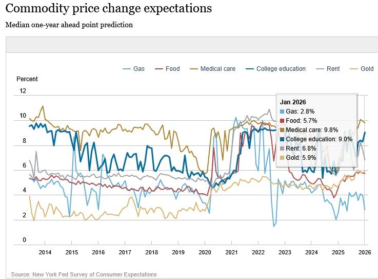 Over the next year consumers expect gasoline prices to rise 2.8%; food prices to rise 5.74%; medical costs to rise 9.8%; the price of a college education to rise 9.03%; rent prices to rise 6.82%