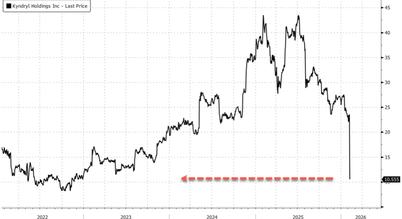 Shares in Kyndryl, an IBM spinoff and IT infrastructure services provider, crashed on Monday after the company warned investors that it is reviewing certain accounting practices amid an inquiry from the Securities and Exchange Commission. The company also posted third-quarter results that missed Bloomberg Consensus estimates and disclosed what JPMorgan analysts described as a “surprise” departure of its CFO.
