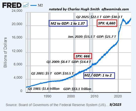 Put another way: is there a way to escape the debasement death-spiral that actually re-sets the economy for legitimate advances in the quality of life after a painful excising of the fatal dependence on ever-soaring debt and debasement to prop up the illusion of “prosperity”?