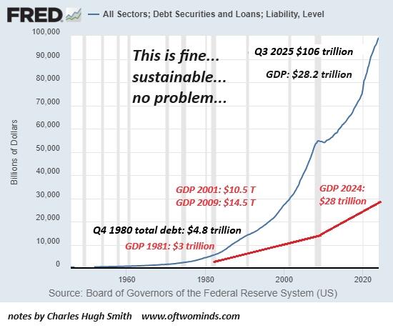 Without a steady expansion of debt and a steady debasement of the dollar so debtors have an easier time paying existing debts, the economy would crash, and so doing more of what leads to collapse is the status quo “solution.”
