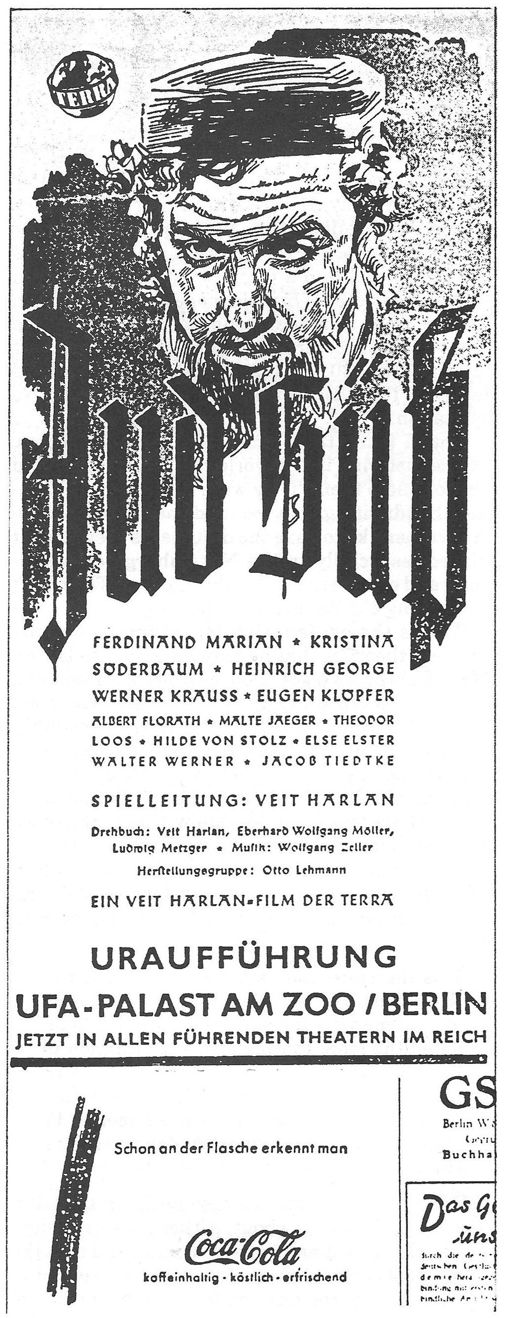 One of the three anti-Jewish films made during the Third Reich era was “Jud Süss” (“The Jew Süss”), which was based on the life of Joseph Süss-Oppenheimer, a powerful “Court Jew” in 18th century Germany. This advertisement announcing the premiere of the Terra film production appeared in the Berlin weekly “Das Reich,” Sept. 29, 1940. An ad for Coca-Cola (“Already recognizable in the bottle”) appeared directly below.