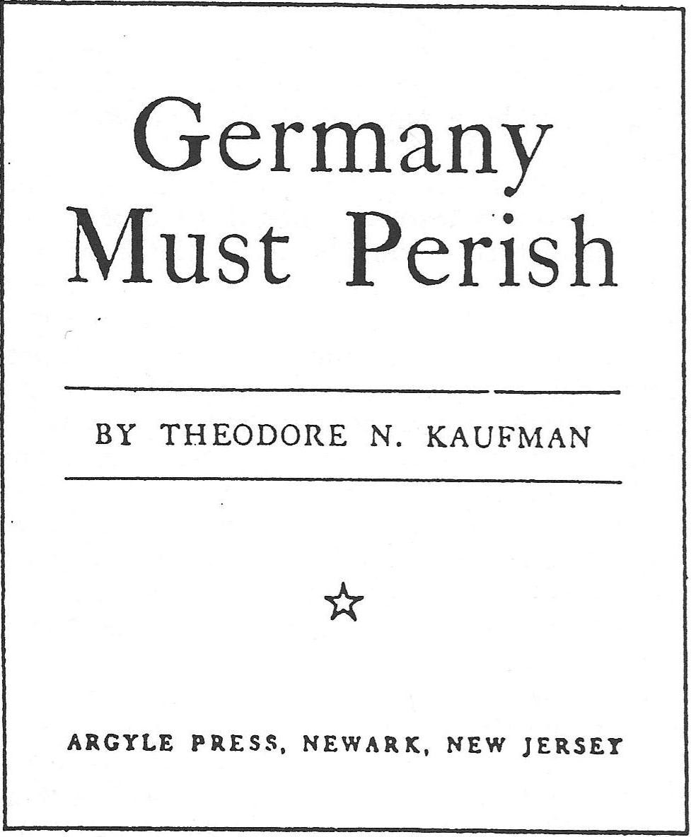 Title page of “Germany Must Perish,” by Theodore N. Kaufman, a Manhattan-born Jewish business man who was chairman of the “American Federation of Peace.” In this 1941 book, Kaufman outlines a plan for the systematic sterilization of the entire German population. This genocidal work was given respectful reviews in the American press. Typical was the one in “Time magazine,” March 24, 1941, which called Kaufman’s plan a “sensational idea.”