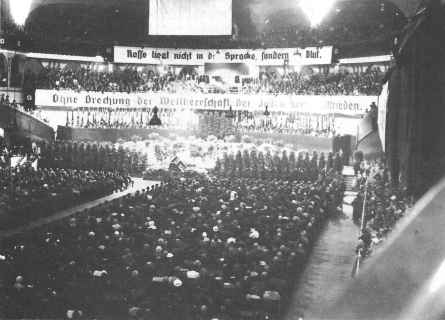 An anti-Jewish rally in Germany, 1935. The banners proclaim: “Race Lies not in the language, but in the blood” and “No World Peace Without Breaking the World Domination of the Jews.” (Photo: National Archives, Washington, DC. From David Irving’s forthcoming biography of Goebbels.)