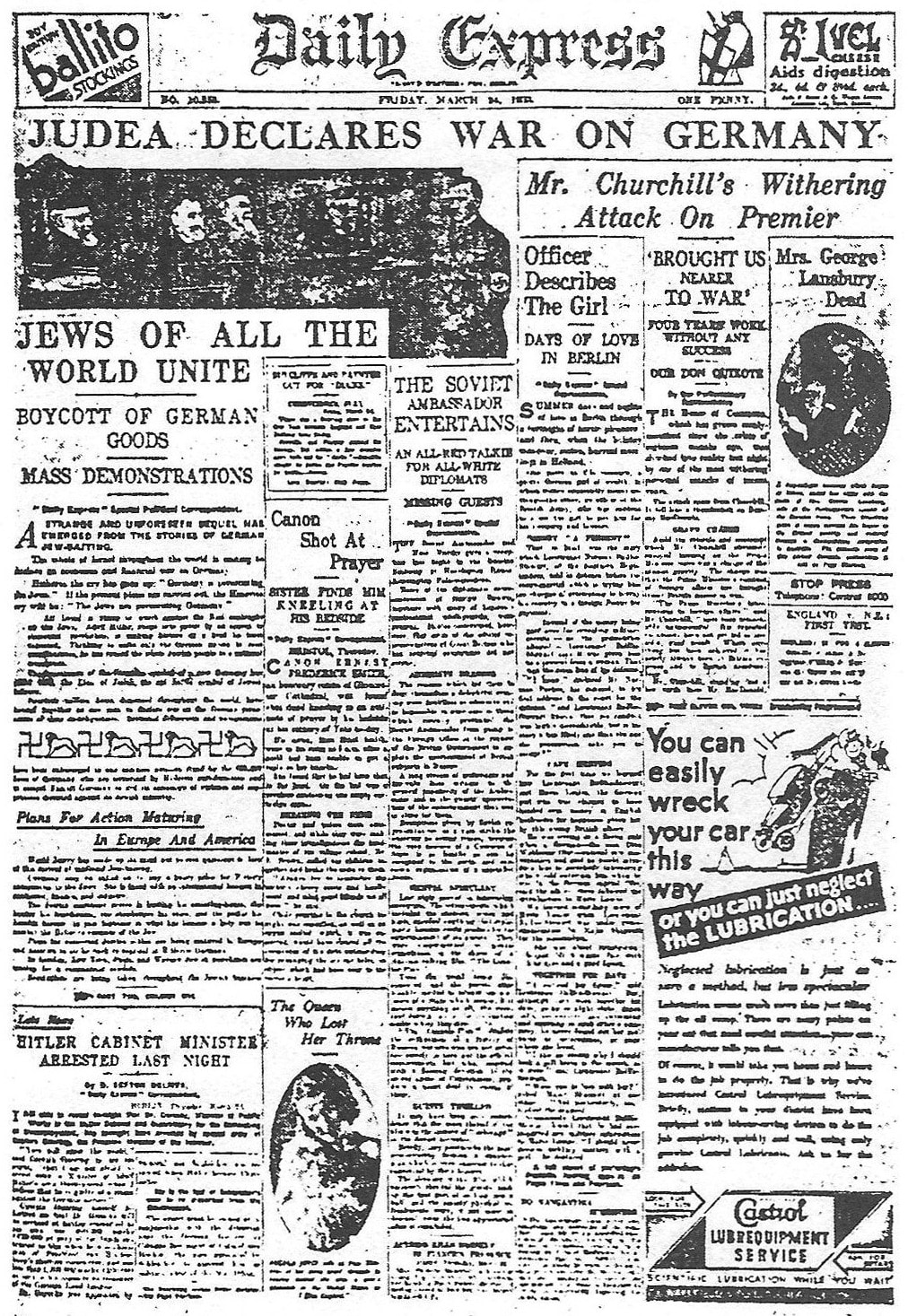“Judea Declares War On Germany. Jews of All The World Unite. Boycott of German Goods,” proclaim headlines in the London Daily Express, March 24, 1933. “The whole of Israel throughout the world is uniting to declare an economic and financial war on Germany,” the mass-circulation British newspaper goes on in its front-page report to tell readers about the international boycott campaign. This Jewish “war on Germany” was launched even before Hitler’s new National Socialist government had enacted its first anti-Jewish law.