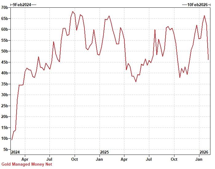 The report covering January 27th – February 3rd, which included a -11.4% drop post Trump’s nomination of Kevin Warsh for Fed Chair, displayed-$13.7bn of Managed Money selling, driven mostly by liquidation (-$12.1bn).