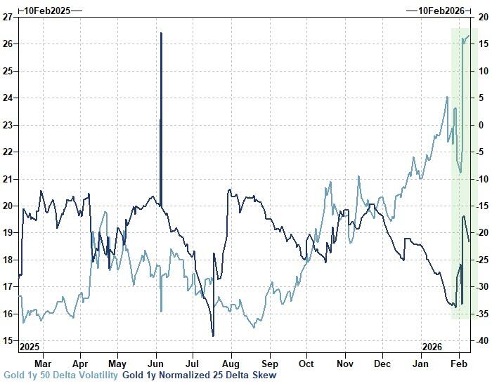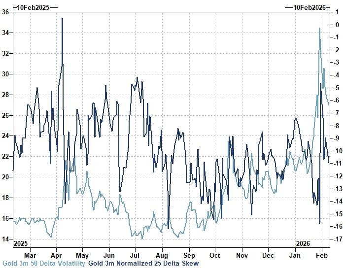 Gold aggregate open interest regained +$2.7bn. Moreover, normalized 25 delta put-call skew cheapened across the curve.