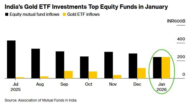 Away from the big banks, retail is well and truly involved as Bloomberg reports that Indian investors poured more money into gold exchange-traded funds than equity mutual funds in January, a rare crossover that highlights sustained demand for bullion despite a record-setting surge fueled by geopolitical and monetary risks.