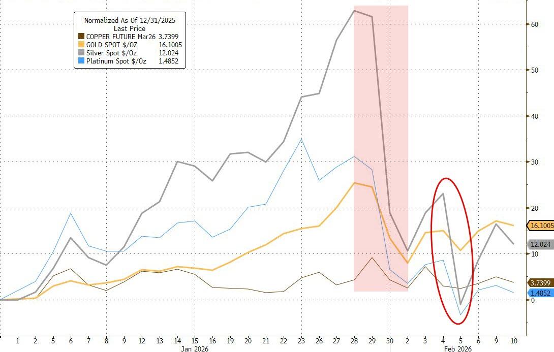 The near-vertical surge in precious metals (arguably driven by speculative demand from China) came to a swift halt at the end of January, when silver suffered its biggest daily drop on record and gold plunged the most since 2013.