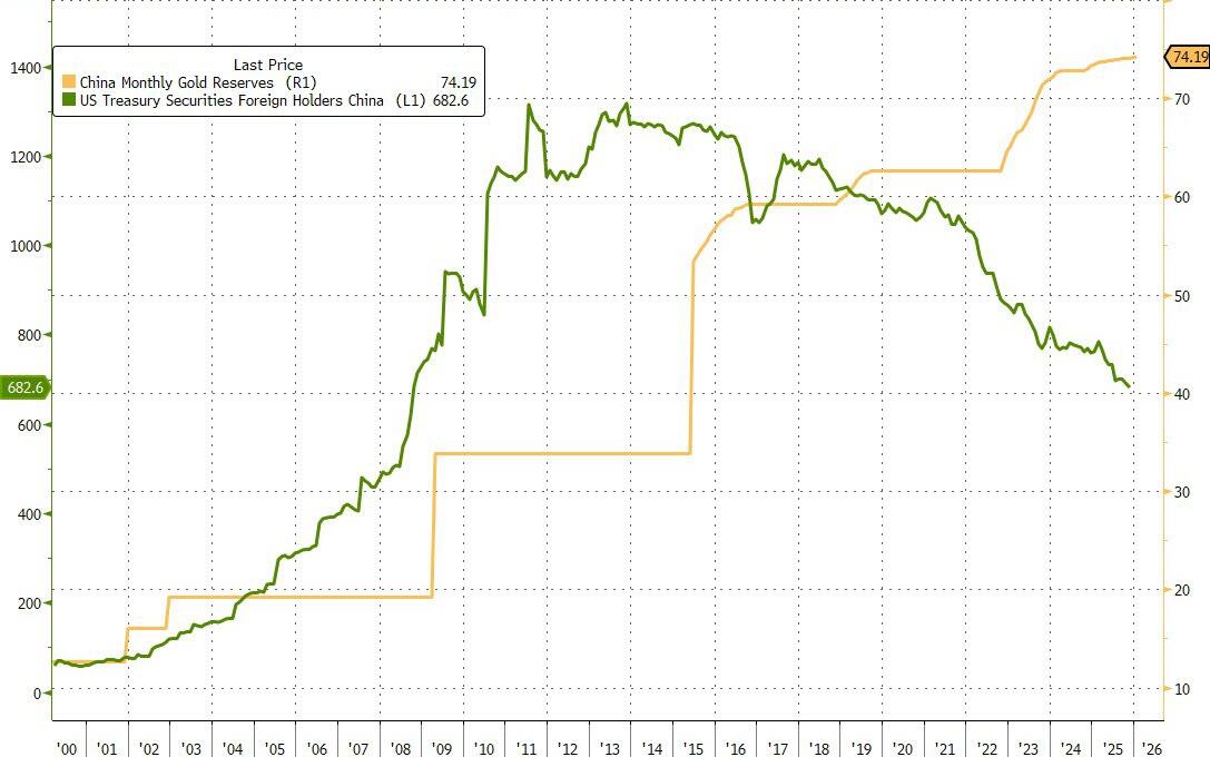 Beijing’s value of gold reserves also surged to $369.58 billion, from $319.45 billion in December 2025.
