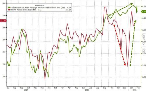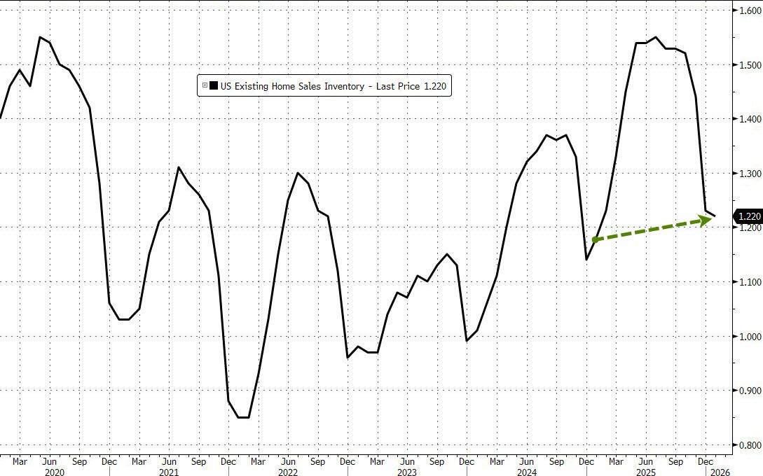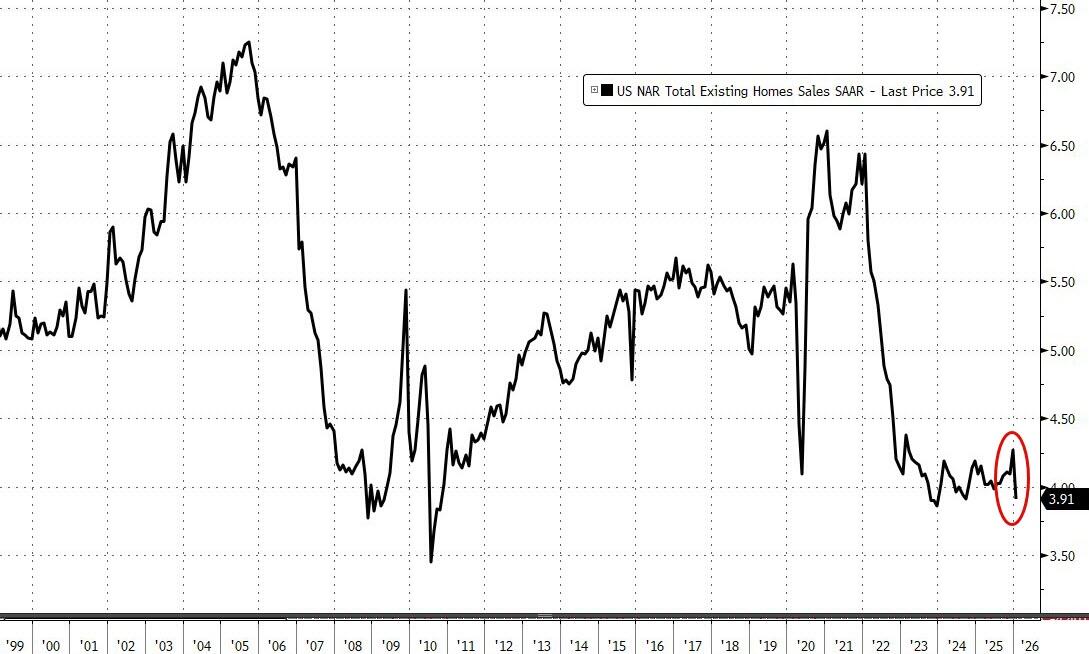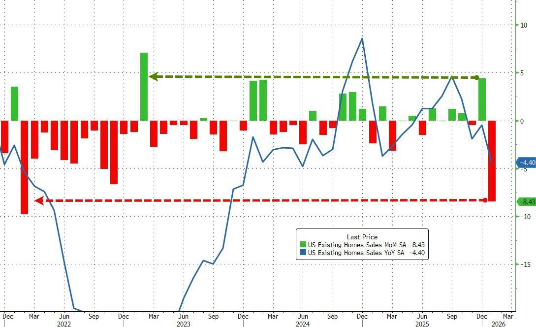 After managing a 1.4% YoY rise in 2025 (dramatically down from the 9.7% YoY rise in 2024, and 33% YoY collapse in 2023), US existing home sales were expected to drop 4.6% MoM in January (following December’s outsized 5.1% MoM surge), despite a tumble in mortgage rates.