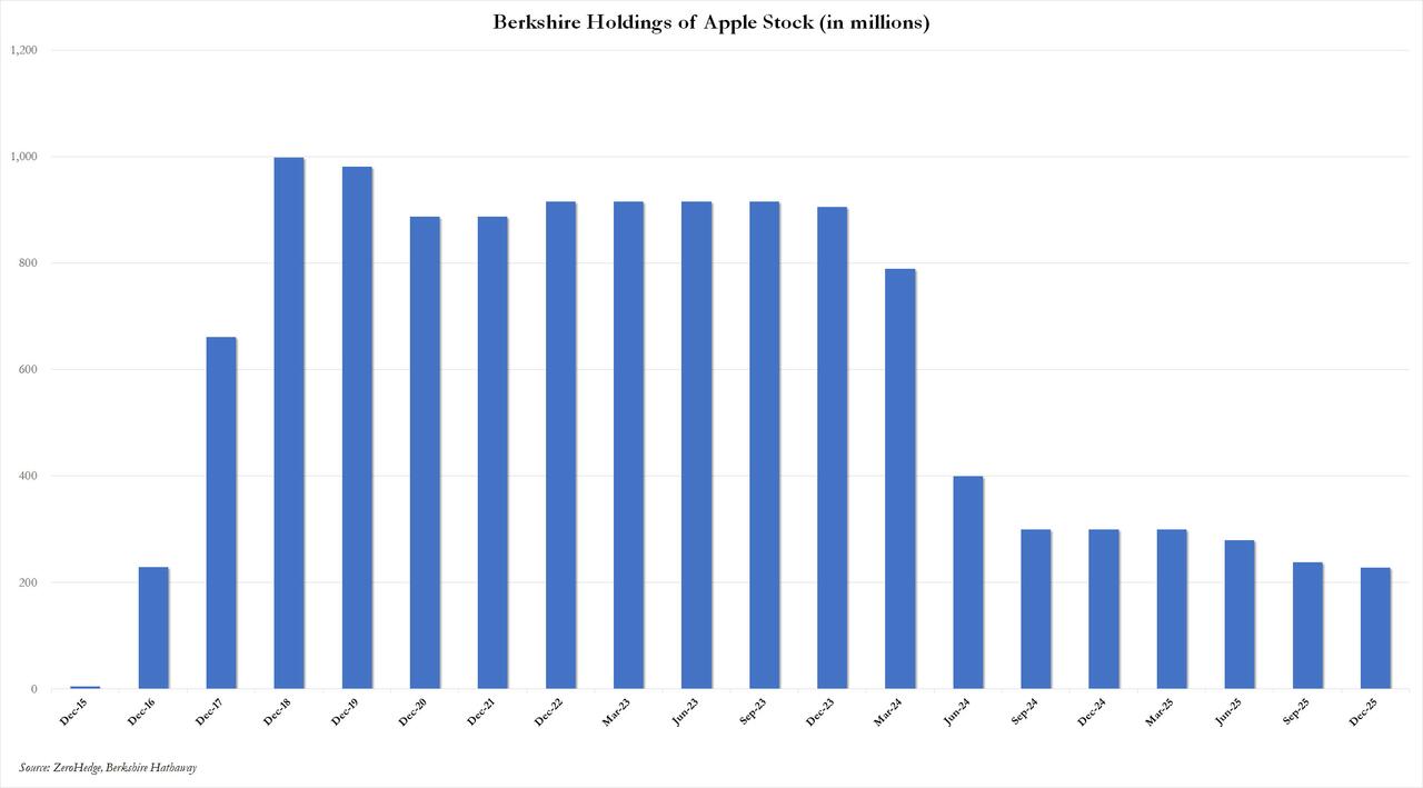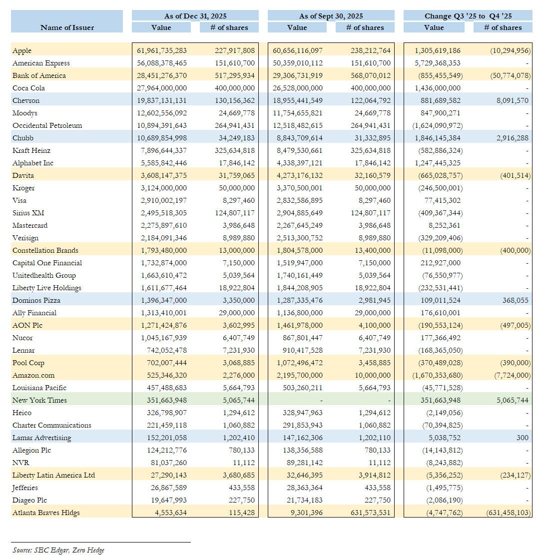 In Warren Buffett’s last quarter as CEO of Berkshire, the Omaha conglomerate slashed several key positions, most notably Amazon which was reduced by over 77%, as well as core holdings Apple and Bank of America, while adding modestly to a handful of stakes such as Chevron and Chubb, and entering a tiny new position in the New York Times, the just published 13F for Q4 2025 revealed.
