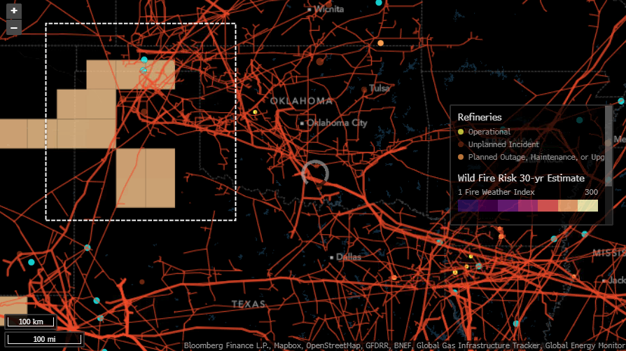 Here are some high-value energy infrastructure assets, including refineries, natural gas hubs, and power plants, that are either near the wildfires or in areas with elevated wildfire risk.