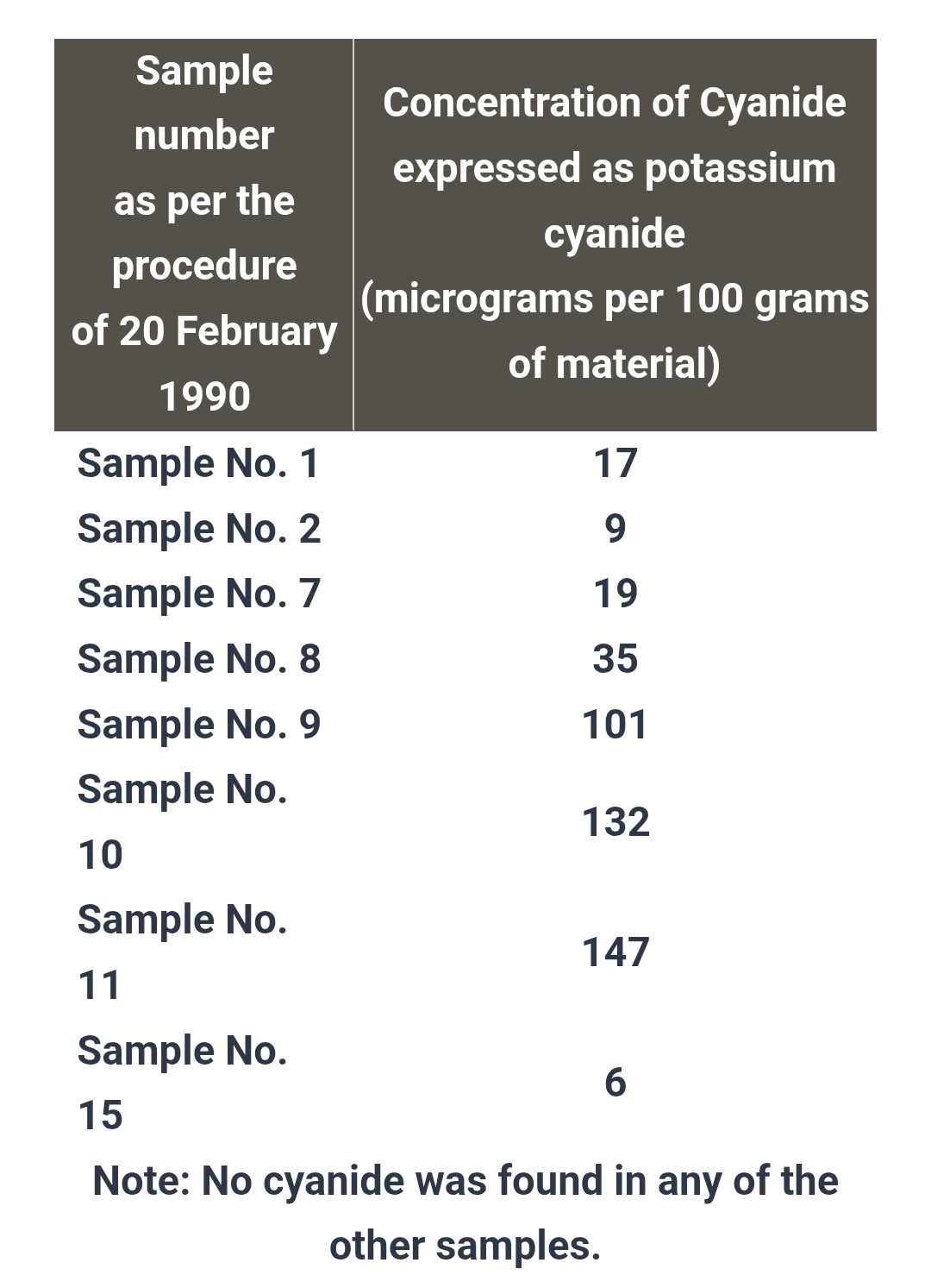 Altogether, 22 samples were removed, including two control samples from a distant place where contamination with HCN [hydrocyanic acid] would not be possible.