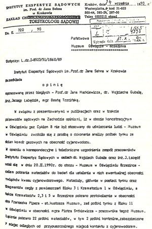 On the basis of an agreement in writing and by telephone, the team of experts of the Institute of Forensic Research, consisting of Dr. Wojciech Gubala and engineer J. Labedz, arrived on 20 February 1990 at the camp and Museum in Auschwitz-Birkenau for the purpose of taking samples for investigation, in order to determine the presence of hydrocyanic acid compounds.