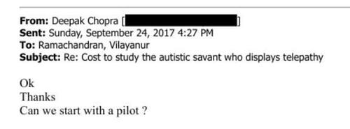 Chopra later emailed Epstein on October 5, 2017 to provide an update on spending the day with Ramachandran to discuss the “pilot study of autistic savants.”