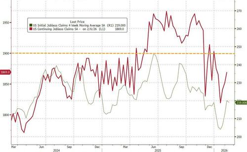 Continuing jobless claims rose modestly (from 1.852mm to 1.869mm) but remains well below the 1.9mm Maginot Line…