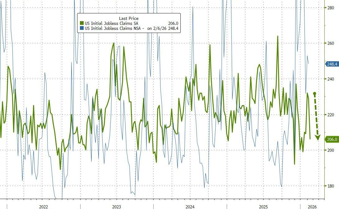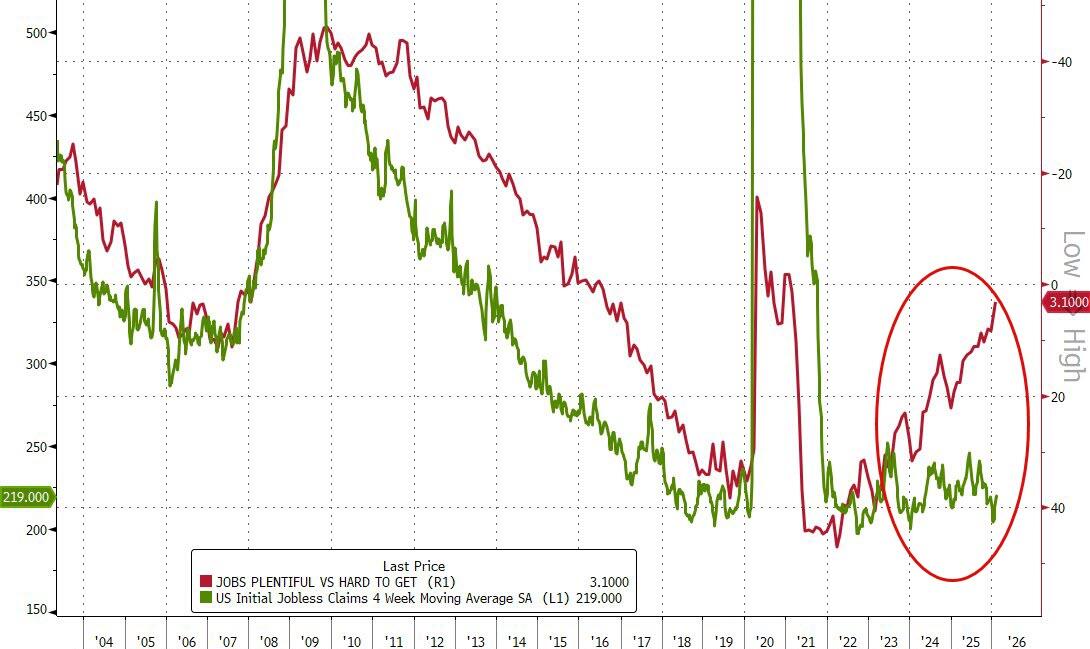 Despite the ongoing worsening trend in some labor market condition indicators – Payrolls revisions ugly, JOLTs are tumbling, Survey-based data showing jobs hard to get far worse than jobs plentiful – the number of Americans filing for jobless benefits for the first time fell to 206k (from 229k the prior week)…
