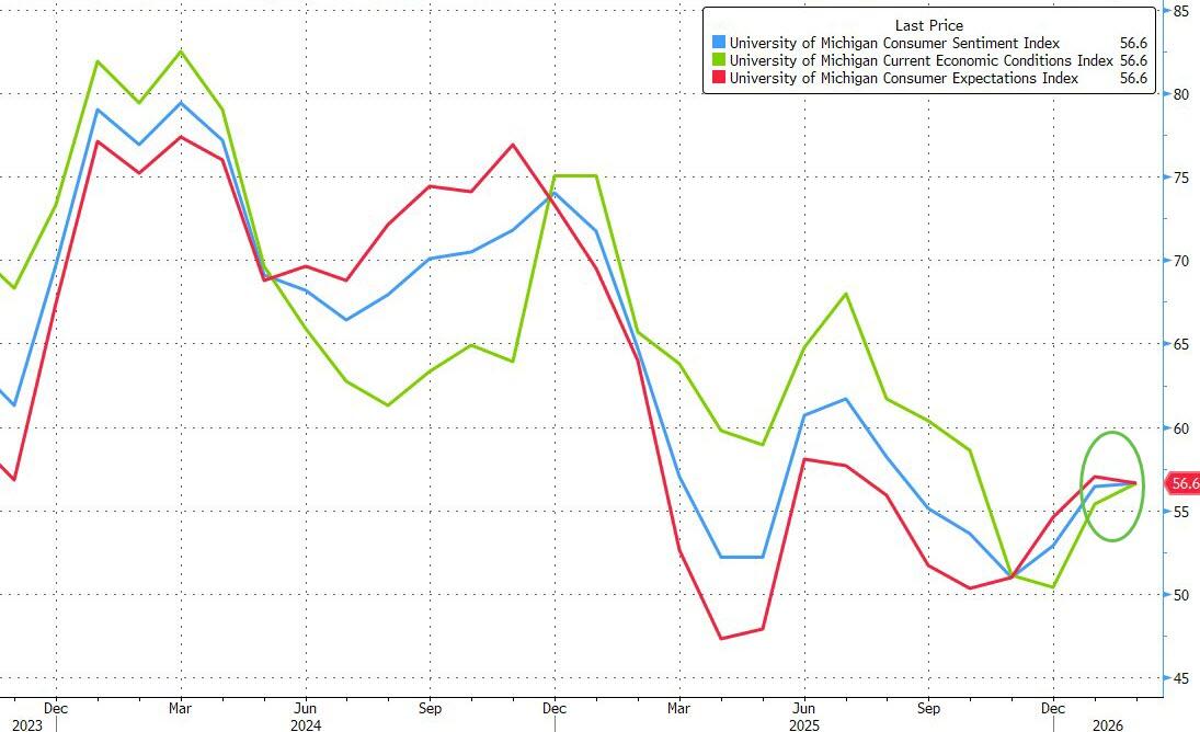 After rebounding strongly in preliminary February data (as Democrats came to their senses over the fearmongered Trump tariff-flation), the final UMich sentiment survey print slipped lower with the headline lowered from 57.3 to 56.6. Both Current Conditions and Expectations were lower than the flash print with the latter falling to 2 month lows and the former holding at 4-month highs…