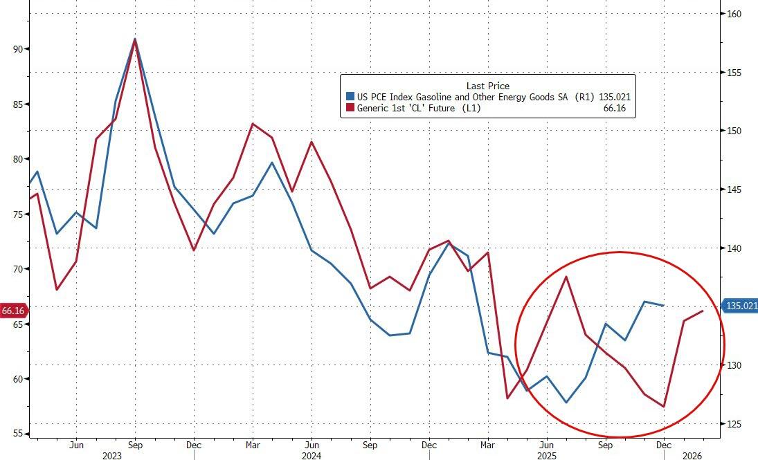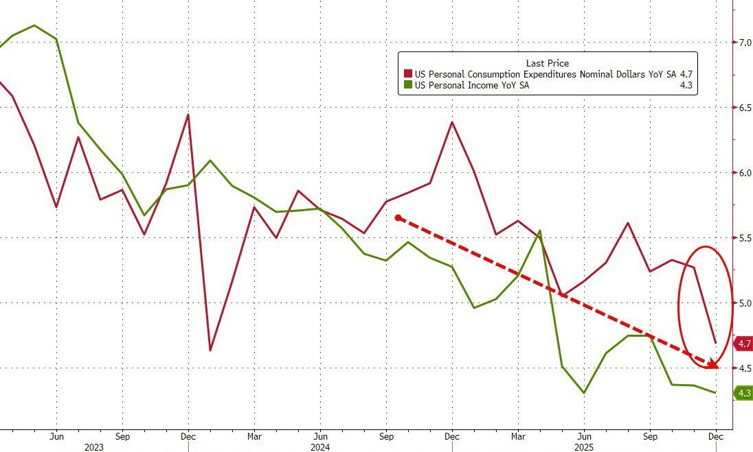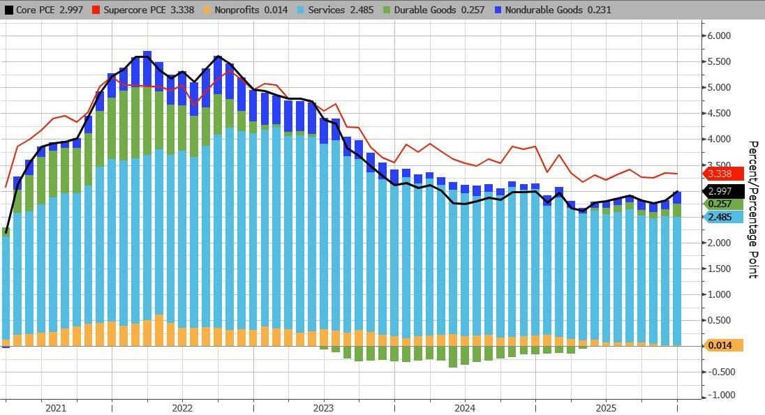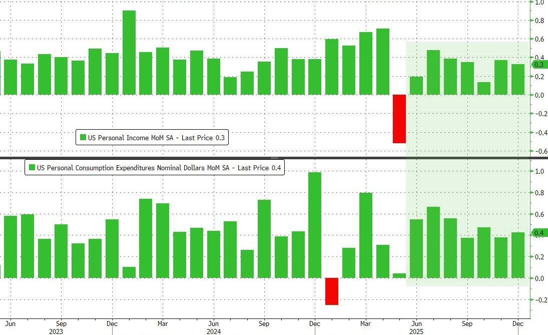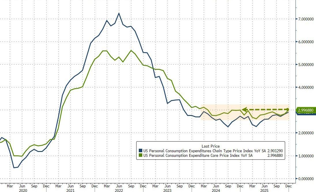 The Fed’s favorite inflation indicator – Core PCE (a measure of price changes in consumer goods and services that excludes volatile food and energy costs) – rose 0.4% in December (the latest data released today), slightly hotter than expected (+0.3% MoM). That lifted YoY inflation up 3.0% (above the prior month and hotter than expected) – the highest since April 2025…