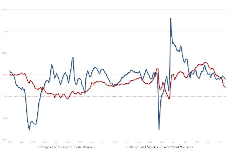 Wage growth is slowing, especially for government workers…