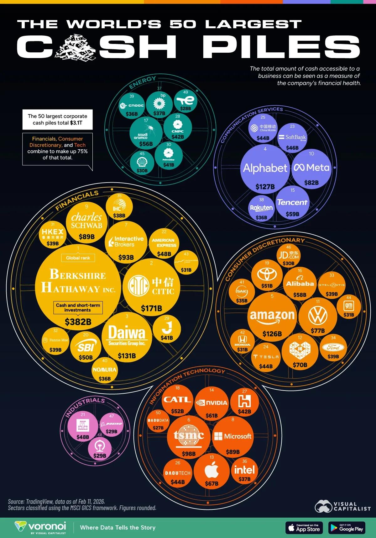 Among the top 50 companies, the Financials sector collectively holds the largest cash reserves at $1.2 trillion—partially driven by strict capital rules requiring banks to maintain large liquid buffers.