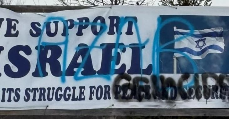 Now there is an oddity here in that aside from the badly-drawn swastika on one signs and ‘genocide’ written in black-spray paint on a pro-Israel sign put up by the synagogue – this is apparently unrelated to the new ‘anti-Semitic hate crime’ and is clearly a bit of anti-Zionist political graffiti and not an ‘anti-Semitic hate crime’ – in that ‘AZAB’ is written across all three signs by the same individual.