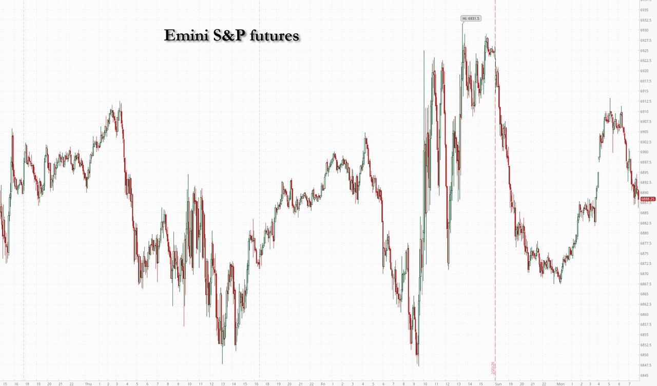 In premarket trading, Magnificent Seven are mostly lower, with the lone exception being GOOGL which rises 0.3% as Wells Fargo upgrades to overweight, calling the search giant an “AI winner.” Others are all down (Nvidia -0.2%, Microsoft -0.5%, Apple -0.5%, Meta Platforms -0.7%, Amazon -0.9%, Tesla -0.9%)