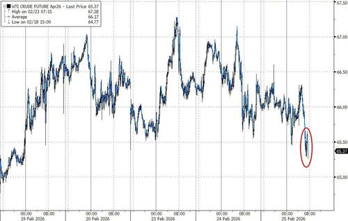 Oil prices are sliding this morning following as an over-supplied market (API reported a huge 11.4mm barrel build last week) beats the geopolitical risk premia (with the US poised to attack Iran).