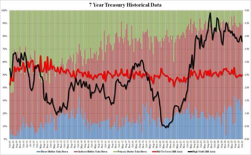 The internals were a bit weaker, with Indirects awarded 63.6%, down from 66.9% in January but above the recent average of 62.6%. And with Directs taking down 26.91%, which was right in line with the six-auction average, Dealers were left with 10.4%, a small drop from last month’s 10.9%.