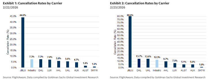 Cancellations were elevated on Sunday 2/22 and Monday 2/23, but largely driven by Winter Storm Hernando. On Sunday 2/22 and Monday 2/23, the industry saw an elevated level of cancellations, some of which were related to the ongoing unrest in Mexico, but with the majority driven by Winter Storm Hernando (see Exhibit 1 and Exhibit 2). For example, JetBlue had significantly higher cancellations than its peers on 2/22, with 44% of flights canceled vs. its competitors canceling less than 10% of flights, but JetBlue has <2% of capacity deployed to Mexico in 1Q 2026. Cancellations at select airports in Mexico were material, even from a global perspective, with Puerto Vallarta and Guadalajara among the top 20 airports with the highest cancellation rates across the world on Sunday 2/22 and Puerto Vallarata in the top 20 again on Monday 2/23 (see Exhibit 3 and Exhibit 4).