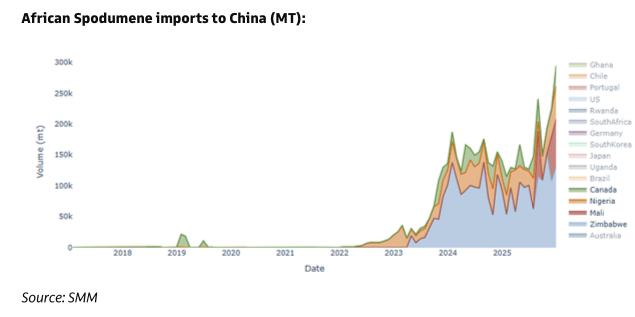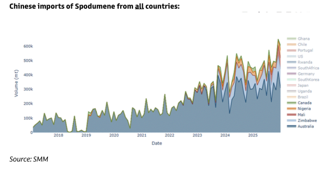 To put this chart into context, in LCE terms, 2025 exports of Zimbabwe Spodumene to China totalled 160kt LCE, virtually all their production.