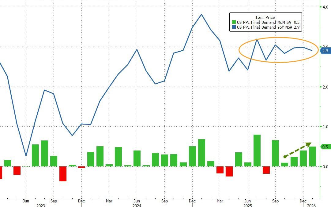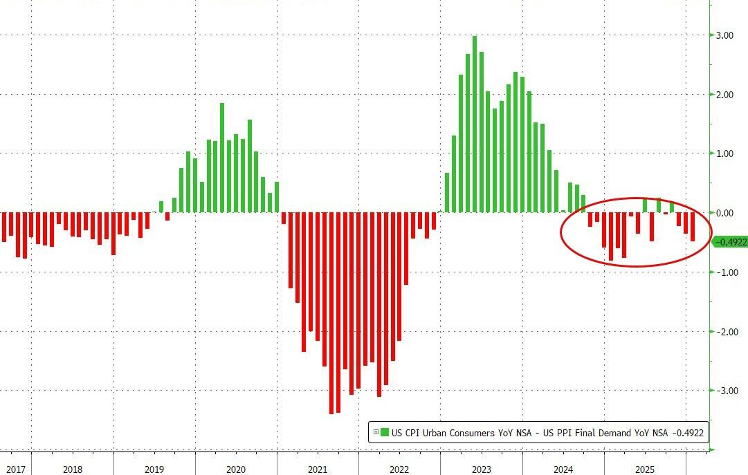 Core PPI (ex food and energy) surged 0.8% MoM and is up 3.6% YoY (both hotter than expected) – the fast pace of price increase since March 2025…