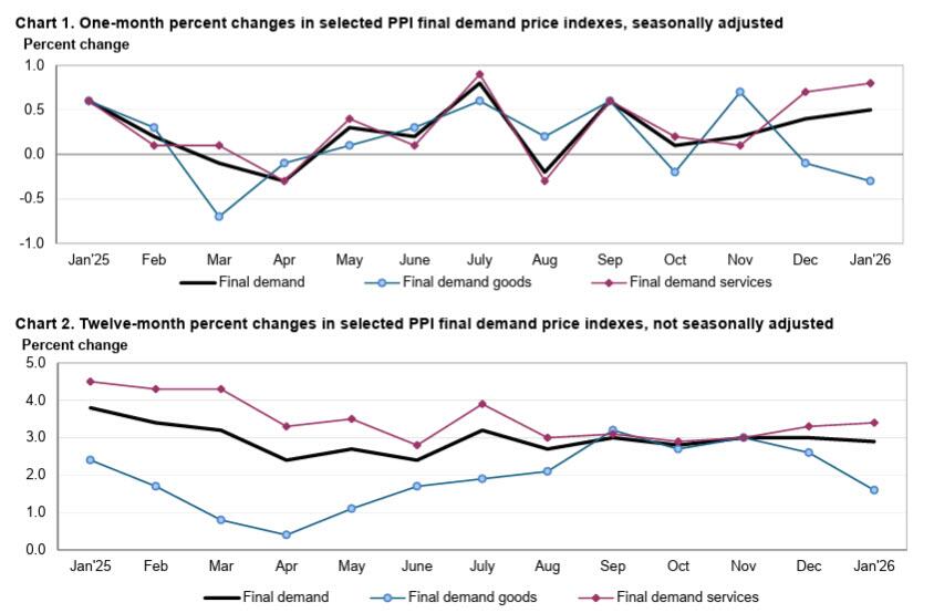 Final demand services: The index for final demand services advanced 0.8% in January, the largest increase since moving up 0.9% in July 2025. Most of the January rise in prices for final demand services can be traced to margins for final demand trade services, which jumped 2.5 percent. (Trade indexes measure changes in margins received by wholesalers and retailers.) Prices for final demand transportation and warehousing services advanced 1.0 percent, while the index for final demand services less trade, transportation, and warehousing was unchanged.
