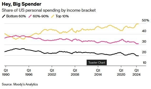 Crucially, economic growth numbers focus only on aggregate performance and do not capture income distribution, regional variations, or the lived experiences of millions of households. A good example of this is the share of U.S. spending by income bracket. Currently, roughly 50% of all consumer spending is driven by the top 10% of income earners, and is increasing, while it is falling for the bottom 90%.