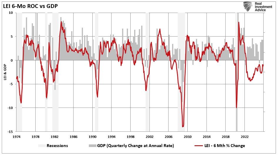However, while economic growth statistics paint a picture of a robust backdrop, other coincident indicators, such as the Conference Board Leading Economic Index (LEI), paint a different picture. For example, the LEI, which tends to lead the US economy by about six months, has remained in contraction for a very long period. Such is why the 6-month rate of change of the LEI has historically been one of the most accurate indicators of contractions and recessions. However, despite a contraction in the LEI, the economy never registered a recession.