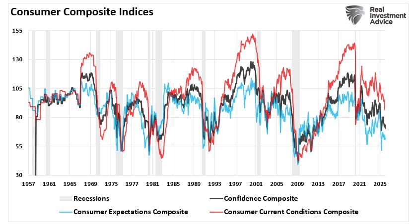 Notably, the divergence between sentiment and economic data is not unique to this moment. Analysts have long noted that consumer mood often lags hard data, and we hope to see sentiment turn higher if the economy continues to expand. It is worth stating that in the short term, surveys often reflect fear and uncertainty, which may depress sentiment even if actual spending behavior remains relatively strong. However, while nominal data suggests that consumer spending remains resilient, that resilience has not been a function of “buying more” products, but simply buying the same amount, or less, at higher prices, which certainly explains the decline in sentiment readings.