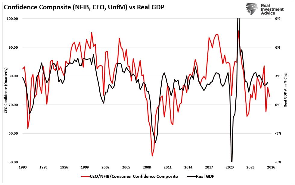 Crucially, understanding that if consumer sentiment drives consumption, and consumption makes up 68% of the economy, that consumption is the demand for small and large businesses. Therefore, if economic growth is robust, we should see demand reflected in increased sentiment across the spectrum. However, as the combined composite shows, those sentiment readings remain weak. Note the correlation between sentiment and the future direction of economic activity.