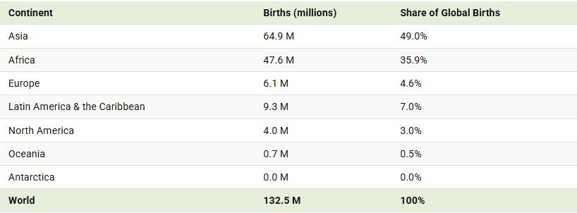 Latin America and the Caribbean are expected to see 9.3 million births, or 7% of the total, while Europe accounts for just 4.6%. North America’s share stands at 3%, reflecting lower fertility rates despite population growth driven by migration. Oceania contributes 0.5% of births, and Antarctica, with no permanent population, records no births at all.