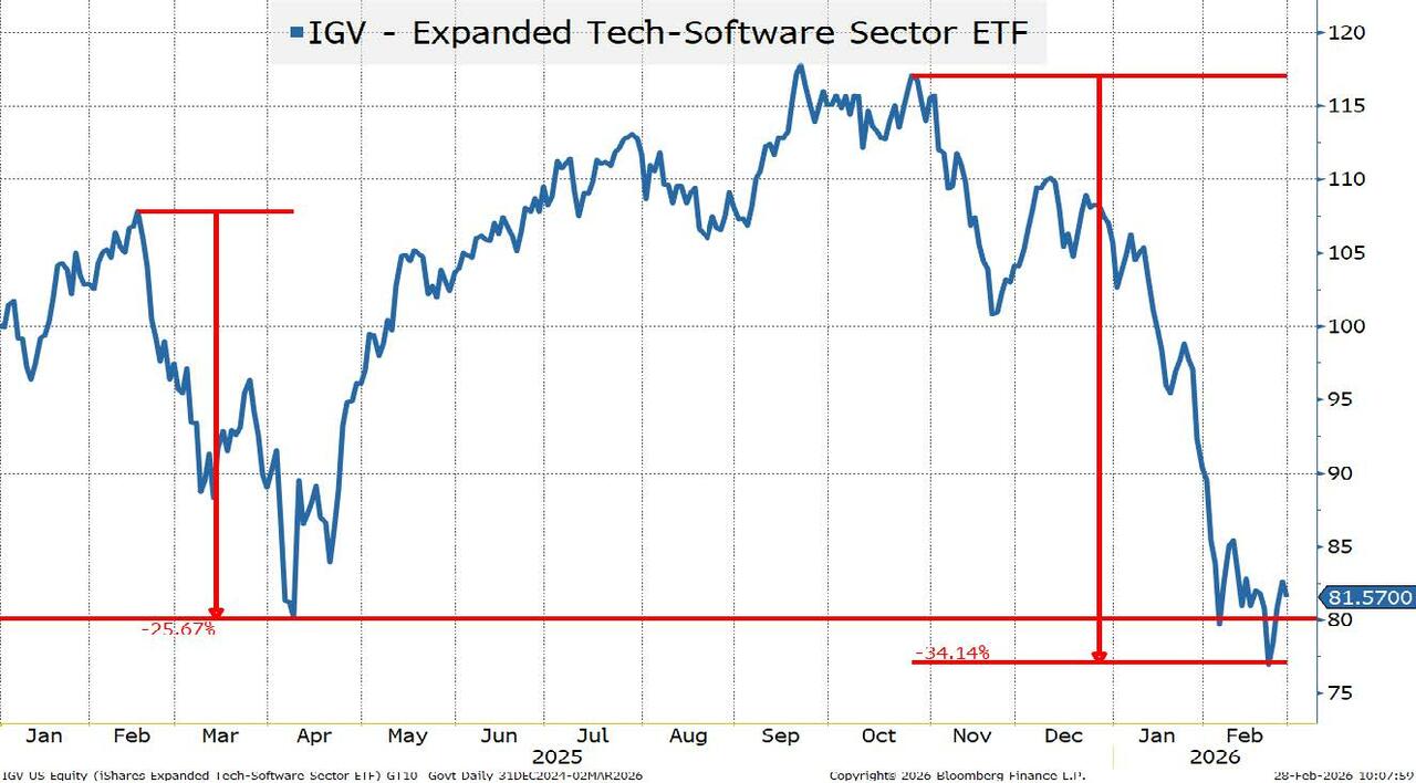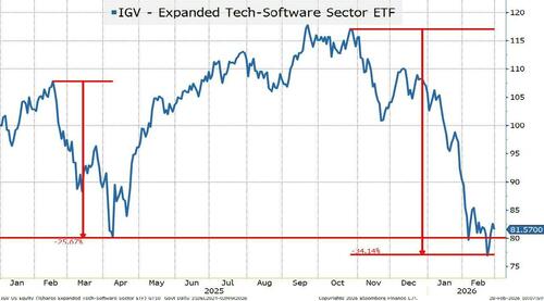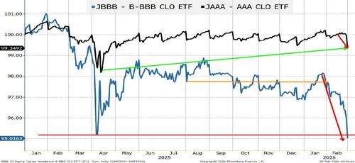 Anything below Liberation Day levels warrants extra attention. Liberation Day was a largely “self-inflicted surprise” that ultimately the admin largely backed away from. This is a bit more worrisome. The sell-off started in Q4, but only now appears to be “rattling” credit markets (BKLN didn’t start selling off until the middle of January). My argument would be that the first part of the “correction” was a valuation adjustment. It is exactly why we had more concerns about stocks than credit. Equity valuations were so strong in some sectors that you could have equities come under pressure, without corresponding pressure on credit. But as that “valuation buffer” erodes, credit and equities will move more in line.