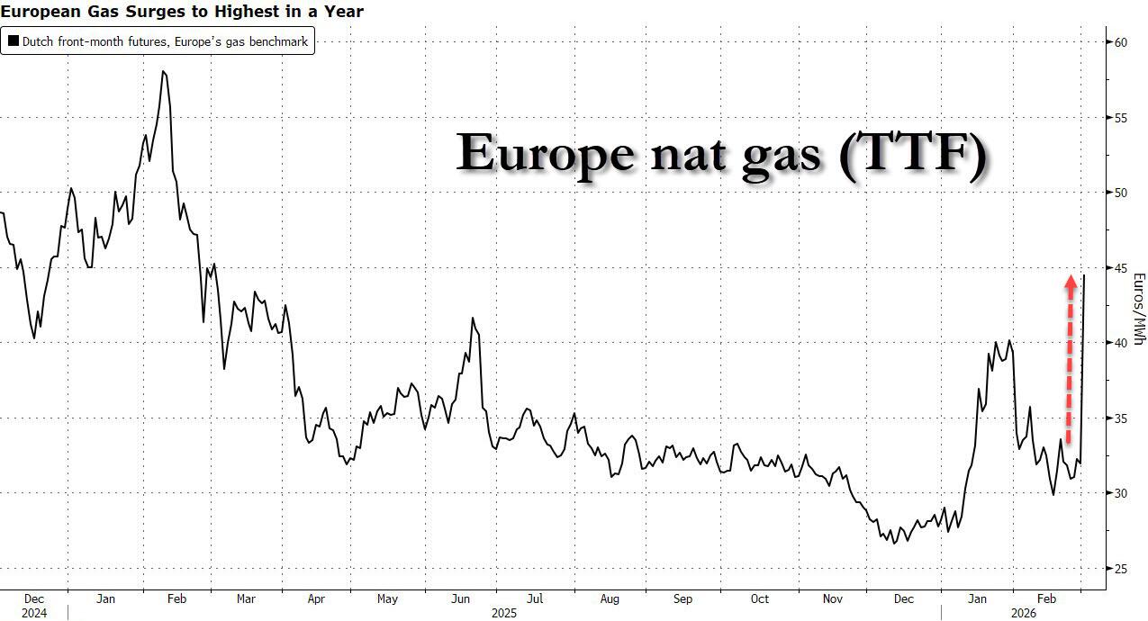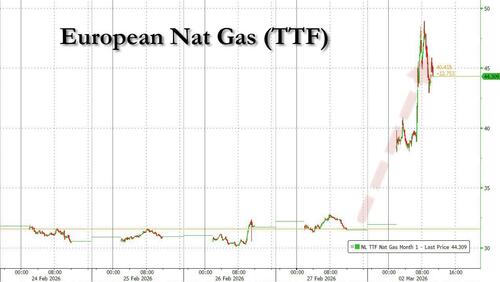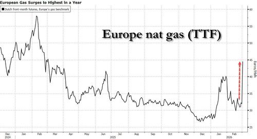 Well, for once Goldman’s commodity research desk was spot on… and very quickly at that, because just one day later, TTF shot up as much as 50%, sparking chaos across Europe’s energy markets in a deja vu moment of the start of the Ukraine war 4 years ago. Dutch front-month futures, Europe’s gas benchmark, traded 46% higher at €46.77 a megawatt-hour by 2:31 p.m. in Amsterdam. That’s the highest level since February 2025.