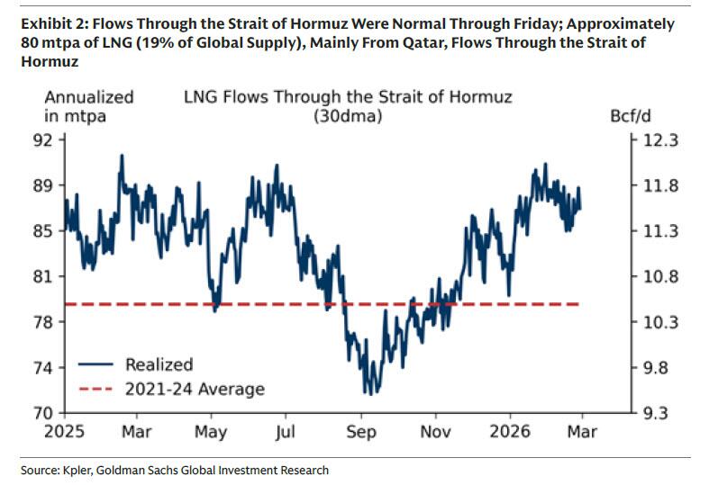 In its scenario analysis of how the Iran war could impact energy markets, Goldman laid out a section dedicated to nat gas, and specifically LNG, which like oil, is one of the commodities that is especially reliant on prompt passage through he Straits of Hormuz to reach its destination.
