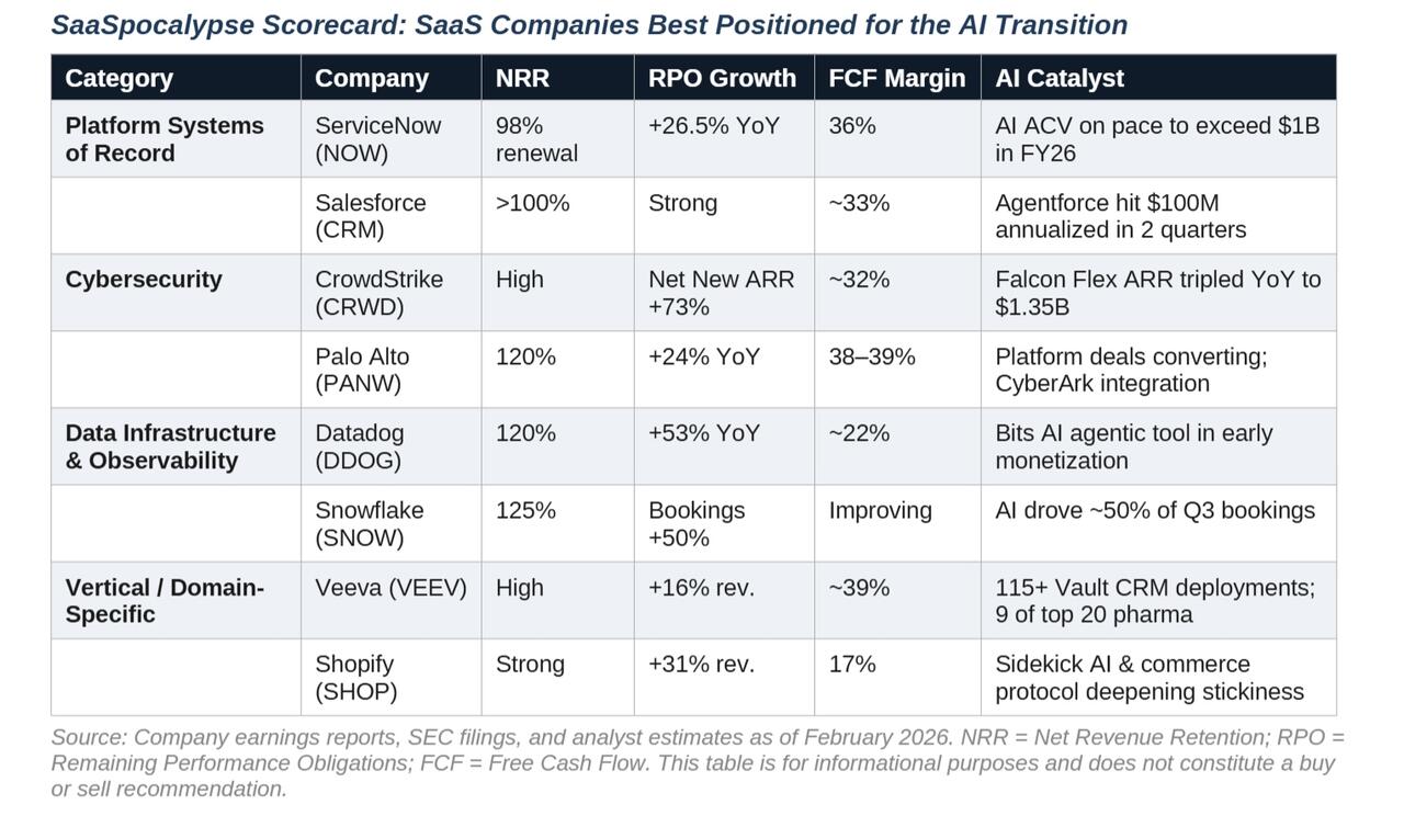 • Third, data infrastructure and vertical SaaS companies that sit at the foundation of AI workloads or control proprietary domain data benefit directly from the same trend punishing commodity application vendors.