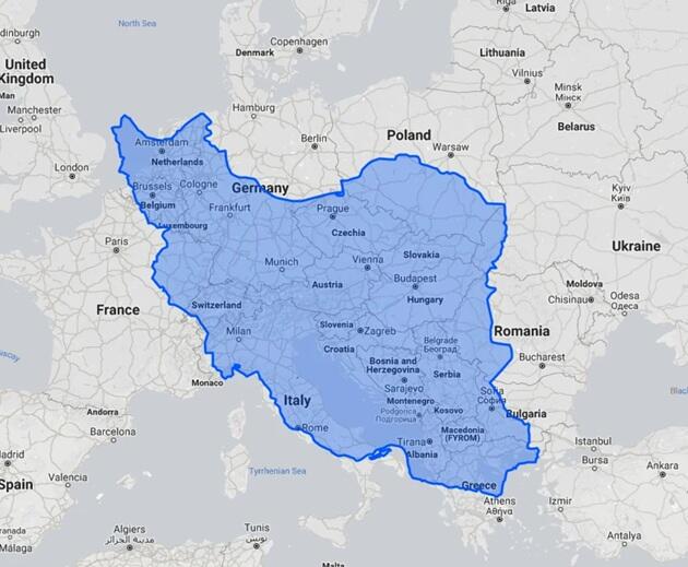 And here’s Iran’s size overlaying the European continent.