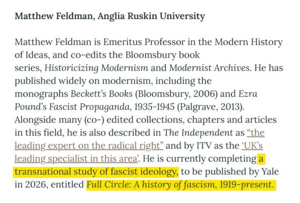 He’s now writing “a transnational study of fascist ideology,” called Full Circle: A history of fascism, 1919 – present.