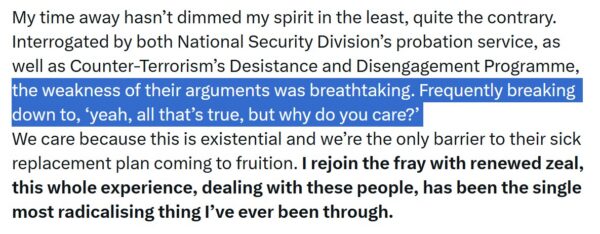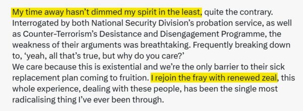 He instructed people not to post stickers in places where they might be considered incitement, such as non-white areas, mosques, or synagogues. At one point, he deleted a message that, after reflection, he thought could be interpreted as incitement. This made no difference. The jury found he “intended” to incite hatred — even though the prosecution had no evidence there had been any “hatred” from anyone.