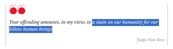 From 2019 to 2021, he made some 200 podcasts, which he posted on Radio Aryan, later renamed Radio Albion. Presiding Judge Huw Rees called the podcasts “a stain on our humanity for our fellow human beings.”
